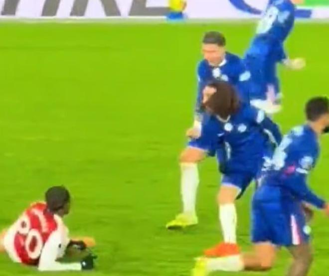 在一次场上事件中,恩佐-费尔南德斯在切尔西禁区边缘成功抢断马杜埃凯,导致后者倒地。